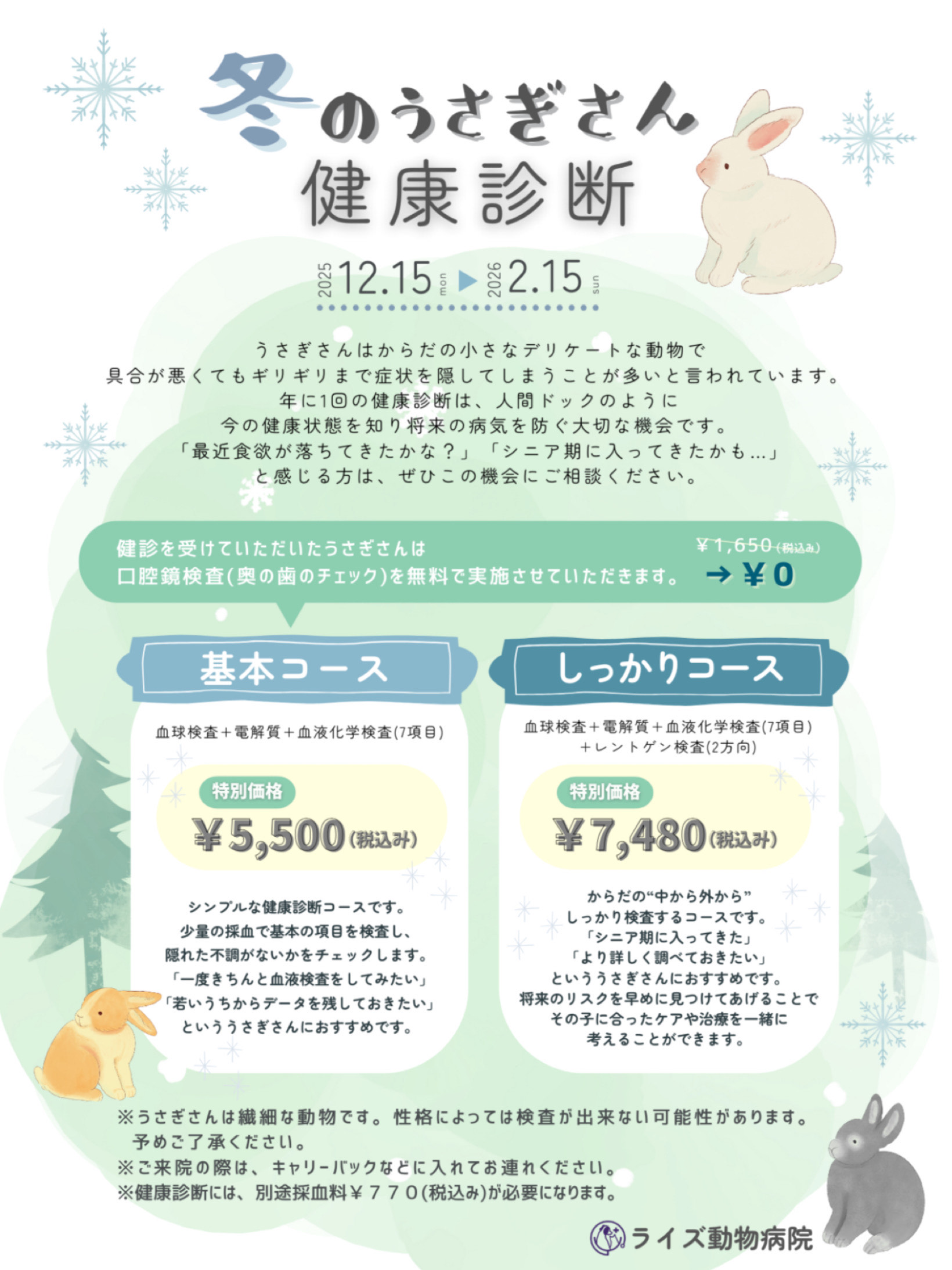 2025.12.16 冬のうさぎさん健康診断のお知らせ 日頃より当院をご利用いただきありがとうございます。 冬のうさぎさんの健康診断のお知らせです。 うさぎは体調の変化を隠してしまう傾向があり、かなり悪くなるまで症状がわからないことが多くあります。 一年に一度、しっかり健康診断を受けることで、そうした変化に早く気付くことが出来ます。 この時期だけの特別なご案内になります。 ぜひこの機会にお家のうさぎさんの健康診断を実施しましょう。